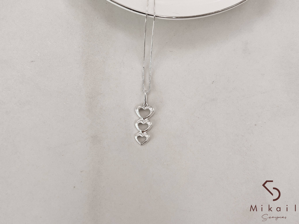 O Colar de Prata 925 Pingente 3 Corações Vazados é uma joia delicada e cheia de significado. Seu pingente de 20mm representa o amor em suas diversas formas – seja o amor-próprio, familiar ou romântico.